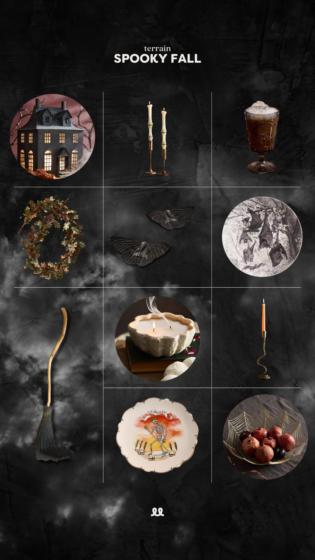 From left to right: haunted chateau | bone taper candles | embossed glasses | faux oak + acorn garland | iron moths, set of 18 | bats serving platter | spooky broom | pumpkin cardamom ceramic candle | snake taper candle holder | tarot stoneware plates | brass web bowl